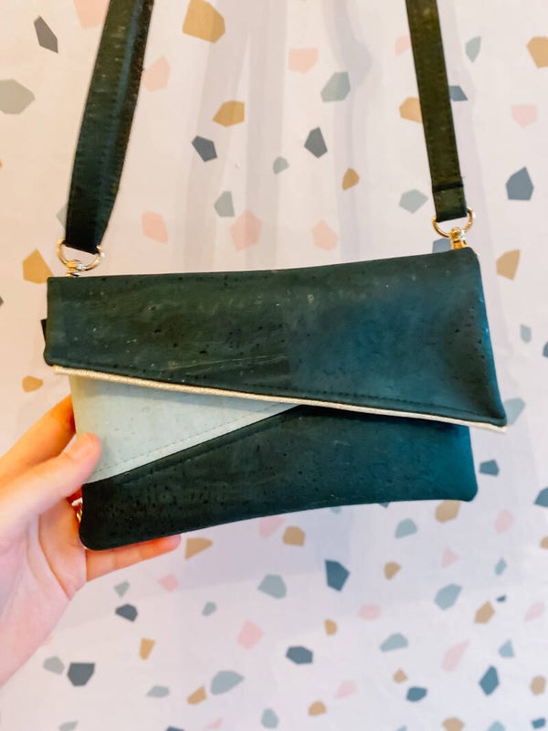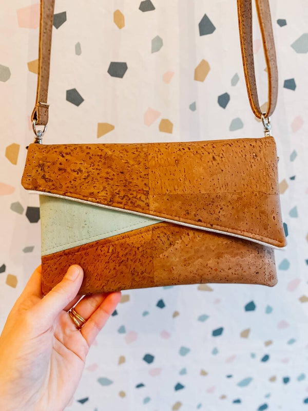 Dit handgemaakt handtasje uit kurkleer is een eigen ontwerp. Je bent dus zeker van een uniek stuk als je kiest om er eentje aan te kopen. Het riempje is afneembaar en verstelbaar zodat je het ook kan gebruiken als clutch. Ook mogelijk met ketting als hengsel.