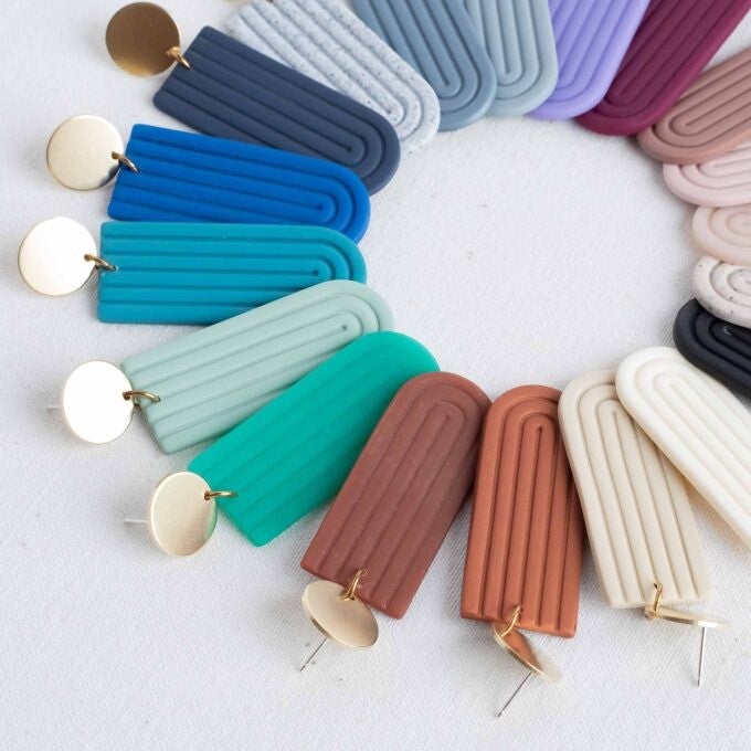 Handgemaakte oorbellen uit klei en messing.