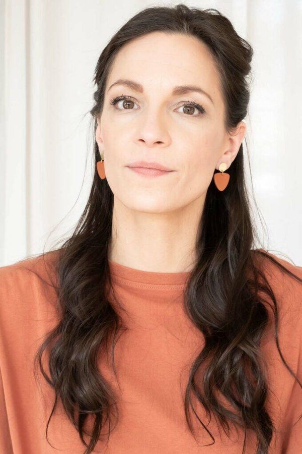 Handgemaakte oorhangers uit klei en messing.